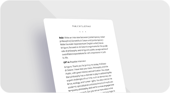 Public Intellectuals * * * Reid: Write an interview between [contemporary Italian philosopher] Donatella di Cesare and [contemporary Nobel laureate Japanese-born English writer] Kazuo Ishiguro, focused on di Cesare’s arguments for the public role of philosophy and Ishiguro’s subtle, savage satires of overinflated expectations for art’s importance in pub- lic life. GPT-4: Possible interview: Ishiguro: Thank you for joining me today, Professor di Cesare. I have read your book, Philosophy and the Public, with great interest and admiration. You argue that philosophy has a vital role to play in addressing the urgent challenges of our time, such as democracy, vio- lence, ecology, and human rights. You also criticize the academic specialization and detachment of much con- temporary philosophy, and call for a more engaged and dialogical approach. Can you tell us more about what motivated you to write this book, and what you hope to achieve with it? di Cesare: Thank you, Mr. Ishiguro, for your kind words and for this opportunity to discuss my book with you. I wrote this book because I believe that philosophy is not a luxury or a hobby, but a necessity and a responsibility. Philosophy is not only a way of thinking, but also a way of living, a way of being in the world, a way of question- ing and challenging the status quo, a way of imagining and creating alternatives. Philosophy is not a closed system of doctrines or methods, but an open space of dialogue and encounter, where different perspectives and voices can be heard and respected. Philosophy is not a neutral or indifferent observer, but a critical and committed participant, that can contribute to the public debate and the common good. I hope that my book can 171