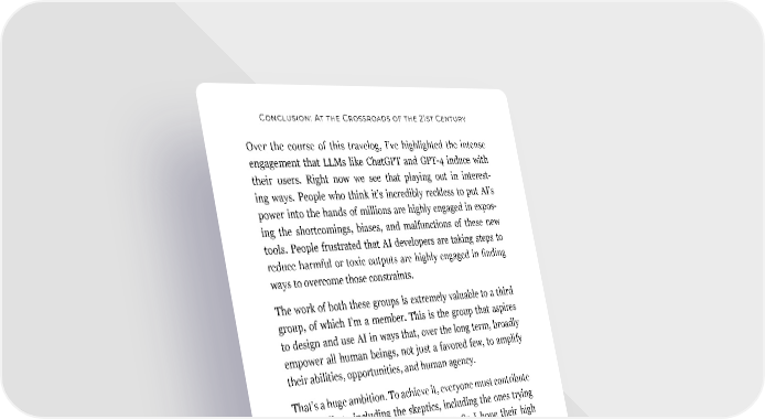 Conclusion: At the Crossroads of the 21st Century Over the course of this travelog, I’ve highlighted the intense engagement that LLMs like ChatGPT and GPT-4 induce with their users. Right now we see that playing out in interest- ing ways. People who think it’s incredibly reckless to put AI’s power into the hands of millions are highly engaged in expos- ing the shortcomings, biases, and malfunctions of these new tools. People frustrated that AI developers are taking steps to reduce harmful or toxic outputs are highly engaged in finding ways to overcome those constraints. The work of both these groups is extremely valuable to a third group, of which I’m a member. This is the group that aspires to design and use AI in ways that, over the long term, broadly empower all human beings, not just a favored few, to amplify their abilities, opportunities, and human agency. That’s a huge ambition. To achieve it, everyone must contribute to the effort—including the skeptics, including the ones trying to undo a product’s safety engineering. So I hope their high engagement continues. The road to utopia is paved with failure and loss To achieve this ambition, we must also accept both the inevita- bility of loss and failure and the necessity of regulation. Harnessing the power of fire brought cooking and the hearth, but it also led to arson and regulations about where you can place a BBQ grill, especially if you live in an apartment. The wheel revolutionized transportation, agriculture, and engineer- ing, but it also paved the way for high-speed car crashes and traffic lights. In the U.S. alone, more than 400 people over the age of fifteen injure themselves in bathtubs or showers each day. So we have 211