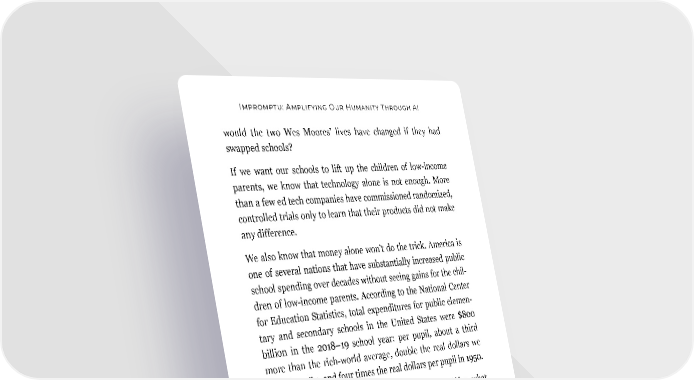 Impromptu: Amplifying Our Humanity Through AI would the two Wes Moores’ lives have changed if they had swapped schools? If we want our schools to lift up the children of low-income parents, we know that technology alone is not enough. More than a few ed tech companies have commissioned randomized, controlled trials only to learn that their products did not make any difference. We also know that money alone won’t do the trick. America is one of several nations that have substantially increased public school spending over decades without seeing gains for the chil- dren of low-income parents. According to the National Center for Education Statistics, total expenditures for public elemen- tary and secondary schools in the United States were $800 billion in the 2018–19 school year: per pupil, about a third more than the rich-world average, double the real dollars we spent in 1980, and four times the real dollars per pupil in 1950. So, can anything really improve schools at scale, and if so, what would it look like? I asked GPT-4, but by the time I provided enough context for GPT-4 to properly engage, the mathemat- ical engines got overwhelmed and GPT-4’s answers became drenched in hallucination and incoherence (a phenomenon we see in early integration of GPT AI with edge-case search engine users). But human experts (such as Andreas Schleicher at the Organ- isation for Economic Co-operation and Development and Sir Michael Barber at the University of Exeter), who have worked with literally dozens of national school systems to determine what improves results at scale for poor children, say the fast- est-improving school systems use technology, along with all 36