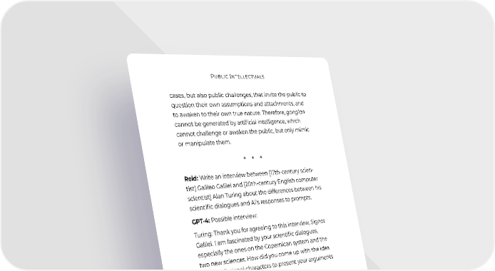 Public Intellectuals cases, but also public challenges, that invite the public to question their own assumptions and attachments, and to awaken to their own true nature. Therefore, gong’an cannot be generated by artificial intelligence, which cannot challenge or awaken the public, but only mimic or manipulate them. * * * Reid: Write an interview between [17th-century scien- tist] Galileo Galilei and [20th-century English computer scientist] Alan Turing about the differences between his scientific dialogues and AI’s responses to prompts. GPT-4: Possible interview: Turing: Thank you for agreeing to this interview, Signor Galilei. I am fascinated by your scientific dialogues, especially the ones on the Copernican system and the two new sciences. How did you come up with the idea of using fictional characters to present your arguments and observations? Galilei: Well, sir, I was inspired by the ancient philoso- phers, such as Plato and Cicero, who used dialogue as a form of inquiry and persuasion. I also wanted to avoid the censorship and persecution of the Church, which condemned the heliocentric theory as heretical. By using dialogue, I could present both sides of the debate, and let the reader judge for themselves who had the stronger case. Turing: I see. And how did you choose the names and personalities of your interlocutors? Galilei: I based them on real people that I knew or admired. For example, Salviati was a friend and fellow mathematician, who supported the Copernican system and defended my views. Sagredo was another friend 183