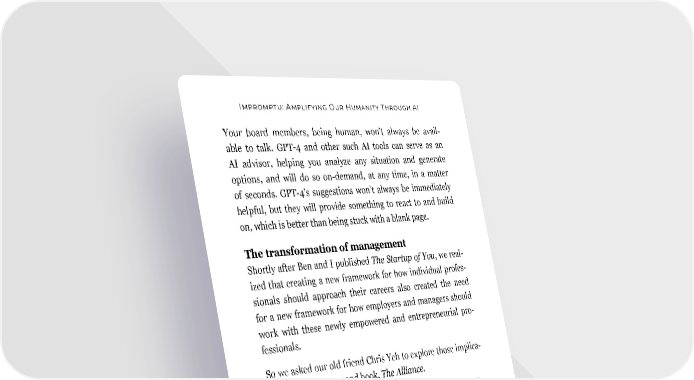 Impromptu: Amplifying Our Humanity Through AI Your board members, being human, won’t always be avail- able to talk. GPT-4 and other such AI tools can serve as an AI advisor, helping you analyze any situation and generate options, and will do so on-demand, at any time, in a matter of seconds. GPT-4’s suggestions won’t always be immediately helpful, but they will provide something to react to and build on, which is better than being stuck with a blank page. The transformation of management Shortly after Ben and I published The Startup of You, we real- ized that creating a new framework for how individual profes- sionals should approach their careers also created the need for a new framework for how employers and managers should work with these newly empowered and entrepreneurial pro- fessionals. So we asked our old friend Chris Yeh to explore those implica- tions with us in a second book, The Alliance. That book’s thesis is that organizations and managers are using outdated metaphors to think about the employment relation- ship. Many CEOs want to think of their employees as family, but family implies a permanent and virtually unbreakable relationship that just isn’t practical in the modern workplace. Other leaders go too far in the other direction, conceiving of their employees as purely free agents, making it nearly impos- sible to build trust, loyalty, and long-term value. The better metaphor, we assert, is to think of employees as allies—independent entities who come together to pursue an important shared mission, complete with an explicit agree- ment about what constitutes success and how success makes 116