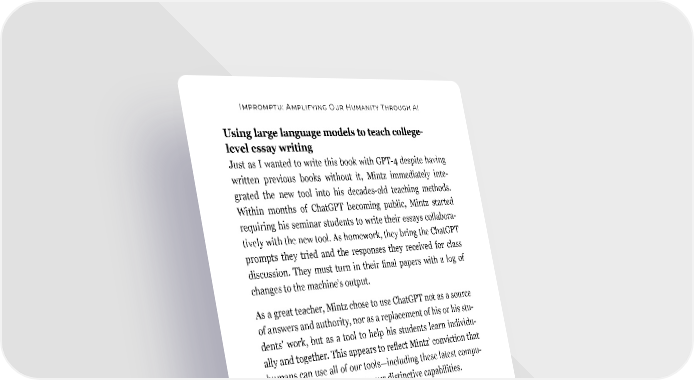 Impromptu: Amplifying Our Humanity Through AI Using large language models to teach college- level essay writing Just as I wanted to write this book with GPT-4 despite having written previous books without it, Mintz immediately inte- grated the new tool into his decades-old teaching methods. Within months of ChatGPT becoming public, Mintz started requiring his seminar students to write their essays collabora- tively with the new tool. As homework, they bring the ChatGPT prompts they tried and the responses they received for class discussion. They must turn in their final papers with a log of changes to the machine’s output. As a great teacher, Mintz chose to use ChatGPT not as a source of answers and authority, nor as a replacement of his or his stu- dents’ work, but as a tool to help his students learn individu- ally and together. This appears to reflect Mintz’ conviction that humans can use all of our tools—including these latest compu- tational miracles—to elevate our distinctive capabilities. Mintz, in a column earlier this year, described ChatGPT as merely another in a series of recent technologies that have altered education: Much as Google devalued the steel-trap memory, elec- tronic calculators speeded up complex calculations, Wikipedia displaced the printed encyclopedia, and online databases diminished the importance of a vast physical library, so, too, platforms like ChatGPT will profoundly alter the most prized skills. This process of leaving laborious tasks to our machines—and using the time thus saved to take on new and difficult tasks 24