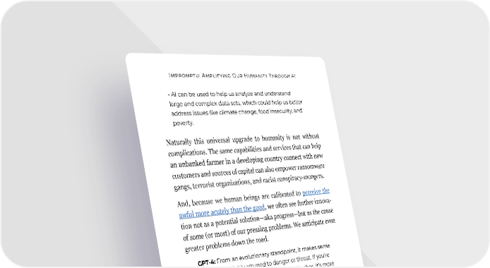 Impromptu: Amplifying Our Humanity Through AI - AI can be used to help us analyze and understand large and complex data sets, which could help us better address issues like climate change, food insecurity, and poverty. Naturally this universal upgrade to humanity is not without complications. The same capabilities and services that can help an unbanked farmer in a developing country connect with new customers and sources of capital can also empower ransomware gangs, terrorist organizations, and racist conspiracy-mongers. And, because we human beings are calibrated to perceive the awful more acutely than the good, we often see further innova- tion not as a potential solution—aka progress—but as the cause of some (or most) of our pressing problems. We anticipate even greater problems down the road. GPT-4: From an evolutionary standpoint, it makes sense for us to be highly attuned to danger or threat. If you’re a caveman and you hear rustling in the bushes, it’s more important for you to be worried about a potential pred- ator than to be excited about a potential meal. Being on high alert for the bad things in life can help us survive. Additionally, I think the negative tends to stand out more to us because it’s often more unexpected or dis- ruptive. We’re used to things going relatively smoothly in our lives, so when something comes along that disrupts that, it’s jarring and grabs our attention. Finally, I think there’s an element of negativity bias that comes from our culture and media. We’re constantly bombarded with bad news and stories of tragedy, which can make it seem like the world is just full of awful things. This can condition us to be hyper-focused on the negative, even when there’s plenty of good in the world too. 194