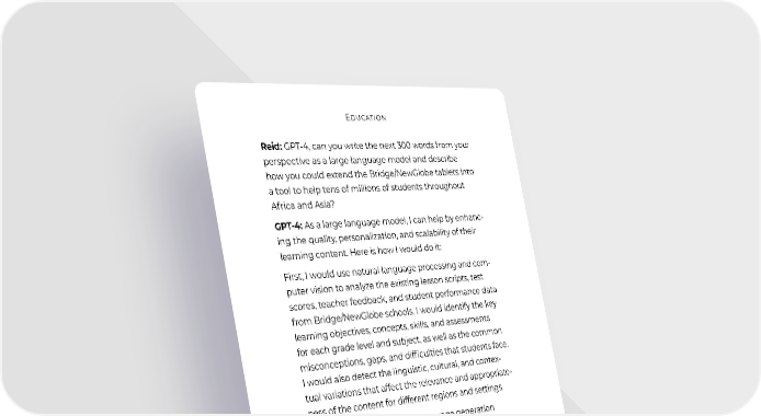 Education Reid: GPT-4, can you write the next 300 words from your perspective as a large language model and describe how you could extend the Bridge/NewGlobe tablets into a tool to help tens of millions of students throughout Africa and Asia? GPT-4: As a large language model, I can help by enhanc- ing the quality, personalization, and scalability of their learning content. Here is how I would do it: First, I would use natural language processing and com- puter vision to analyze the existing lesson scripts, test scores, teacher feedback, and student performance data from Bridge/NewGlobe schools. I would identify the key learning objectives, concepts, skills, and assessments for each grade level and subject, as well as the common misconceptions, gaps, and difficulties that students face. I would also detect the linguistic, cultural, and contex- tual variations that affect the relevance and appropriate- ness of the content for different regions and settings. Second, I would use natural language generation and computer graphics to create new and improved lesson scripts, activities, exercises, and multimedia resources that are aligned with the learning objectives and adapted to the local needs and preferences of the students and teachers. I would use techniques such as question generation, answer extraction, feedback provision, and adaptive sequencing to make the content more interactive, responsive, and personalized. Third, I would use natural language understanding and speech recognition to monitor and support the delivery and use of the content by the teachers and students. I would also use techniques such as speech-to-text, text- to-speech, and machine translation to enable the users to communicate with the content and with each other in their preferred languages and modes. 43