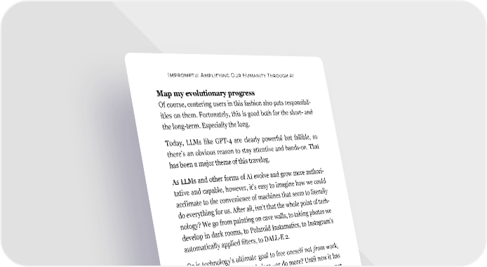 Impromptu: Amplifying Our Humanity Through AI Map my evolutionary progress Of course, centering users in this fashion also puts responsibil- ities on them. Fortunately, this is good both for the short- and the long-term. Especially the long. Today, LLMs like GPT-4 are clearly powerful but fallible, so there’s an obvious reason to stay attentive and hands-on. That has been a major theme of this travelog. As LLMs and other forms of AI evolve and grow more authori- tative and capable, however, it’s easy to imagine how we could acclimate to the convenience of machines that seem to literally do everything for us. After all, isn’t that the whole point of tech- nology? We go from painting on cave walls, to taking photos we develop in dark rooms, to Polaroid Instamatics, to Instagram’s automatically applied filters, to DALL-E 2. Or is technology’s ultimate goal to free oneself not from work, but for work? To help us do less—or do more? Until now it has always been the latter. I hope it continues to be the latter, not just for a few of us, but for most of us. I should emphasize that I use the word “work” here expansively. I mean human effort, human creativity, and human productiv- ity in all its variations—paid work, volunteer work, family work, artistic expression—whatever gives one purpose, meaning, and a sense of accomplishment and growth. I don’t want AI to erase that. I want AI to amplify that. But we have to be extremely intentional to achieve this outcome. There are versions of an AI future that could lead us down less beneficial roads—with the added challenge that these particular 218