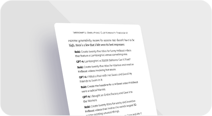 Impromptu: Amplifying Our Humanity Through AI extreme generativity means its success rate doesn’t have to be high. Here’s a few that I felt were its best responses: Reid: Create twenty-five titles for funny MrBeast videos that feature a Lamborghini versus something else. GPT-4: Lamborghini vs 10,000 Balloons: Can It Float? Reid: Create twenty-five titles for hilarious and creative MrBeast videos involving hot sauce. GPT-4: I Filled a Pool with Hot Sauce and Dared My Friends to Swim in It Reid: Create the headline for a MrBeast video if MrBeast were a radical Marxist. GPT-4: I Bought an Entire Factory and Gave It to the Workers Reid: Create twenty titles for wacky and inventive MrBeast videos that involve the world’s largest 3D printer printing unusual things. GPT-4: I 3D Printed a Giant Ice Cream Cone and Ate It with a Forklift Reid: Create twenty titles for crazy MrBeast videos involving commercial space travel. GPT-4: I Hired Elon Musk to Be My Personal Space Guide Since I’m not exactly in MrBeast’s demo, I’m definitely not the best judge of GPT-4’s performance here. But don’t you want to see if 10,000 balloons can make a Lamborghini float? At the very least, GPT-4 performed well enough to make me wonder what MrBeast and his team might come up with if they tried to generate prompts with it, too. If they ever do, they’ll have a lot of company. Already, YouTube is filled with literally thousands of videos about ChatGPT. My 98