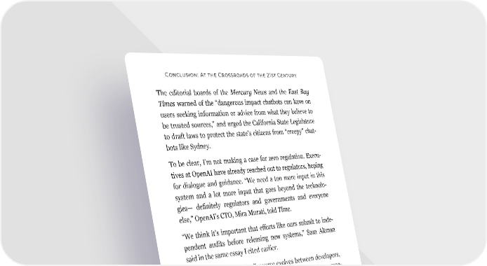 Conclusion: At the Crossroads of the 21st Century The editorial boards of the Mercury News and the East Bay Times warned of the “dangerous impact chatbots can have on users seeking information or advice from what they believe to be trusted sources,” and urged the California State Legislature to draft laws to protect the state’s citizens from “creepy” chat- bots like Sydney. To be clear, I’m not making a case for zero regulation. Execu- tives at OpenAI have already reached out to regulators, hoping for dialogue and guidance. “We need a ton more input in this system and a lot more input that goes beyond the technolo- gies— definitely regulators and governments and everyone else,” OpenAI’s CTO, Mira Murati, told Time. “We think it’s important that efforts like ours submit to inde- pendent audits before releasing new systems,” Sam Altman said in the same essay I cited earlier. My hope is that, as this discourse evolves between developers, regulators, and other key stakeholders, we don’t fall into a reac- tionary, top-down, legislate-fast-and-break-things mindset. I hope that instead we stay future-oriented and democratic in our AI-development approaches. In the long term, the best way to create AI tools that can be used by individuals rather than on them happens when we give millions of people from around the world opportunities to par- ticipate in AI development. AI tools informed by the aspirations and experiences of many people, with different expectations, goals, and use cases, are far likelier to be more robust and more inclusive than tools developed in secrecy by computer engi- neers alone. 217