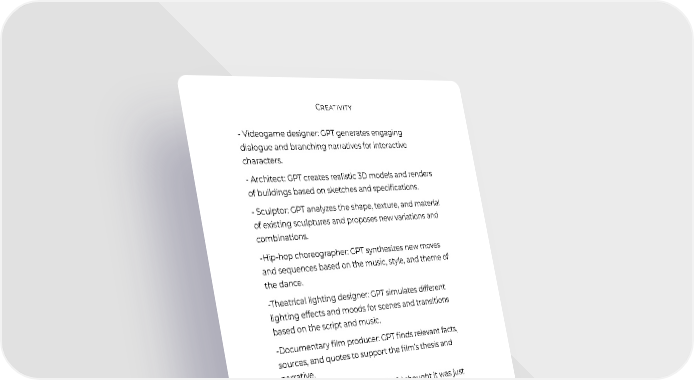Creativity - Videogame designer: GPT generates engaging dialogue and branching narratives for interactive characters. - Architect: GPT creates realistic 3D models and renders of buildings based on sketches and specifications. - Sculptor: GPT analyzes the shape, texture, and material of existing sculptures and proposes new variations and combinations. -Hip-hop choreographer: GPT synthesizes new moves and sequences based on the music, style, and theme of the dance. -Theatrical lighting designer: GPT simulates different lighting effects and moods for scenes and transitions based on the script and music. -Documentary film producer: GPT finds relevant facts, sources, and quotes to support the film’s thesis and narrative. Reid: GPT can create 3D models? I thought it was just text output. Similarly: GPT can “synthesize moves”? How? Where is the output I can see? GPT-4: There are different versions and applications of GPT that can produce different types of output, such as image generation, data analysis, or code writing. Simi- larly, there are other GPT models that can specialize in generating 3D models, lighting effects, or audio editing, based on text input or other modalities. For example, DALL-E is a GPT-3 variant that can create images from text descriptions, while Jukebox is a neural network that can generate music and lyrics. These models are not perfect, but they demonstrate the potential of GPTs to help improve the creative practices of various types of artists and creators. 57