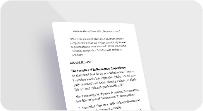 When AI Makes Things Up (“Hallucinations”) GPT-4 is not the World Brain, but it could be a valuable component of it, if we use it wisely and ethically. It could help us to create a more informed, rational, and creative humanity, ready to face the future with confidence and hope. Well said, H.G.-PT! The varieties of hallucinatory AIxperience An admission: I don’t like the term “hallucinations.” To my ear, it somehow sounds both euphemistic (“Relax, it’s just some goofy nonsense!”) and unduly alarming (“Watch out, hippie! This GPT stuff could make you jump off a roof!”) Also, it’s covering a lot of ground. By my count, there are at least four different kinds of “hallucinations” LLMs can produce: 1) Nonsensical. These are probably the least problematic kind, because they’re the easiest to identify. 2) Plausible, but incorrect. These are arguably the most prob- lematic kind, because they can be quite hard to identify— specifically because LLMs like GPT-4 have become so good at presenting information with convincing authority. 3) Responses where the LLM seems to claim capacities it doesn’t actually have, such as sentience or emotion, or (per Microsoft’s Sydney) saying it could spy on users, order a pizza, or take any number of actions that language-predic- tion software can’t actually do. 4) Deliberate and destructive hallucinations, such as when a user prompts an LLM to generate false information that the user intends to use to mislead, confuse, or produce some other negative effect. 157