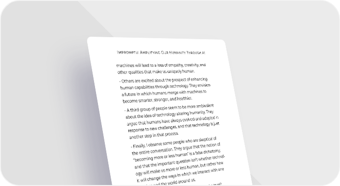 Impromptu: Amplifying Our Humanity Through AI machines will lead to a loss of empathy, creativity, and other qualities that make us uniquely human. - Others are excited about the prospect of enhancing human capabilities through technology. They envision a future in which humans merge with machines to become smarter, stronger, and healthier. - A third group of people seem to be more ambivalent about the idea of technology altering humanity. They argue that humans have always evolved and adapted in response to new challenges, and that technology is just another step in that process. - Finally, I observe some people who are skeptical of the entire conversation. They argue that the notion of “becoming more or less human” is a false dichotomy, and that the important question isn’t whether technol- ogy will make us more or less human, but rather how it will change the ways in which we interact with one another and the world around us. Reid: Could all four of these perspectives be true? GPT-4: Yes, I believe that they could all have some truth to them. Human beings are complex, and there is no single answer to the question of how technology will impact humanity. It seems likely that different people will experience and interpret the changes in differ- ent ways. Reid: OK, so technology can be a tool to help us be more human, a threat to our humanity, or the core of who we already are—and this can change from situation to sit- uation. Do you see patterns of how those three ideas of technology and humanity have been defined over time? GPT-4: Throughout history, people have often defined technology in relation to the idea of humanity. For example, in the early days of industrialization, many 204