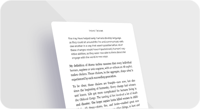 Homo Techne fire may have helped early humans develop language, as they could sit around the fire and communicate with one another in a way that wasn’t possible before. All of these changes would have impacted early humans’ cog- nitive abilities, as they were now able to think about and engage with the world in new ways. My definition of Homo techne assumes that every individual human, sapiens or ante-sapiens, with or without an AI copilot, makes choices. Those choices, in the aggregate, shape what is experienced by each succeeding generation. To be clear, those choices are fraught—ours now, but also since the beginning of humanity. Every change had winners and losers. Life got more complicated for humans living in the Olduvai Gorge. The taming of fire involved a lot of death and disaster. The larger sapien brain killed women in child- birth. All three—stone, fire, and brain—enabled great new weapons that humans used, among other things, to hurt and kill other humans. If the ante-sapiens had been able to talk about it, might things have gone differently? Today, since we have sapiens brains, the internet, and also GPT, maybe we can actually bring more intentionality to these kinds of choices than Lucy and her ante-sapiens had available to them. And yet, despite evidence that for millions of years, the use and development of tools has amplified and accelerated the evolu- tion of our cognitive and social abilities, we still tend to view technology as a dehumanizing force instead of the thing that makes us, us. 201