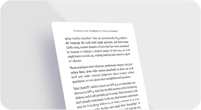 Introduction: Moments of Enlightenment oping “toxicity classifiers” that can automatically flag problem- atic language the LLM itself might generate; and fine-tuning LLMs using curated datasets of texts that have been annotated by humans to indicate a desired output. In this way, an LLM might learn to avoid, say, making tasteless jokes about a report- er’s divorce. These techniques don’t eliminate problematic outputs, they just reduce them. Even with various guardrails in place, an LLM itself can’t make reasoned judgments about complex ethical quandaries, or even about more straightforward questions. Take ChatGPT, which is based on GPT-3.5, an immediate pre- decessor to GPT-4. Ask it for the fifth sentence of the Gettysburg Address, and it will probably get it wrong. That’s because LLMs don’t actually understand, in the way that humans understand, what the Gettysburg Address is, or what a sentence is, or even how counting works. So they can’t apply their “knowledge” of these things in a way that a human might. (“I’ll find the text of the Gettysburg Address, then count sentences until I get to the fifth one.”) Instead, an LLM is always just making statisti- cal predictions about what the next word in a given text string should be. From its training, though, ChatGPT has clearly come to associ- ate the words “Gettysburg Address” with other words—specifi- cally, the text of the speech. So when you ask ChatGPT for the fifth sentence of the Gettysburg Address, it will almost certainly give you a sentence from the Gettysburg Address, but probably not the fifth sentence. In fact, I bet it will be the ninth sentence. 13