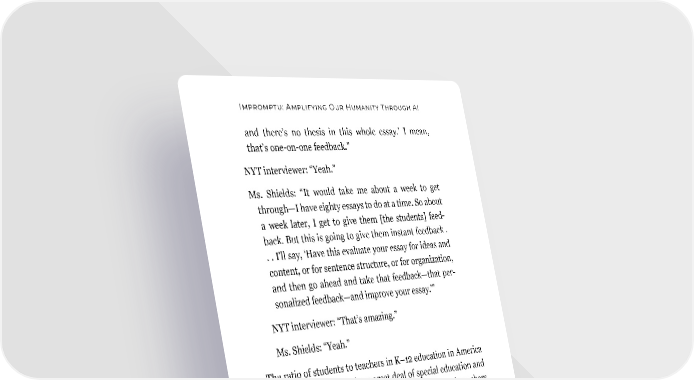 Impromptu: Amplifying Our Humanity Through AI and there’s no thesis in this whole essay.’ I mean, that’s one-on-one feedback.” NYT interviewer: “Yeah.” Ms. Shields: “It would take me about a week to get through—I have eighty essays to do at a time. So about a week later, I get to give them [the students] feed- back. But this is going to give them instant feedback . . . I’ll say, ‘Have this evaluate your essay for ideas and content, or for sentence structure, or for organization, and then go ahead and take that feedback—that per- sonalized feedback—and improve your essay.’” NYT interviewer: “That’s amazing.” Ms. Shields: “Yeah.” The ratio of students to teachers in K–12 education in America is 15:1. Since that includes a great deal of special education and other 1:1 staffing situations, many high school English teachers will have thirty or more students in a classroom, and must give feedback to over a hundred students at a time. This can amount to twenty or more hours of extra work per week. Immediate personalized feedback for every student essay, even if imper- fect, could transform the work experience of English teachers around the country. And tenth-grade English essays may be just the start. Reid: GPT-4, give short examples—not including the example of generating immediate essay feedback—of how large language models could help teachers get leverage and deliver great instruction to large classes of students. 38