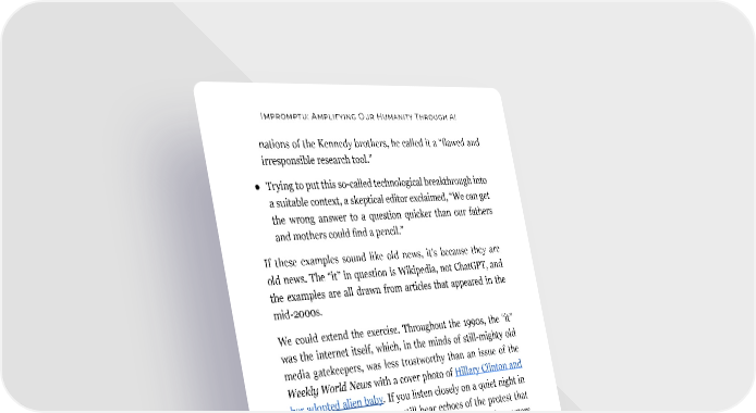 Impromptu: Amplifying Our Humanity Through AI nations of the Kennedy brothers, he called it a “flawed and irresponsible research tool.” ● Trying to put this so-called technological breakthrough into a suitable context, a skeptical editor exclaimed, “We can get the wrong answer to a question quicker than our fathers and mothers could find a pencil.” If these examples sound like old news, it’s because they are old news. The “it” in question is Wikipedia, not ChatGPT, and the examples are all drawn from articles that appeared in the mid-2000s. We could extend the exercise. Throughout the 1990s, the “it” was the internet itself, which, in the minds of still-mighty old media gatekeepers, was less trustworthy than an issue of the Weekly World News with a cover photo of Hillary Clinton and her adopted alien baby. If you listen closely on a quiet night in Washington, D.C., you can still hear echoes of the protest that erupted when web news pioneer Matt Drudge trolled reporters at the National Press Club by boasting that his accuracy rate was around 80 percent. I don’t bring all this up to excuse complacency about LLMs’ performance. In my own experience using GPT-4, I’ve seen it make up false details about my Masters of Scale podcast. I’ve seen it generate phony links when I’ve asked it to cite sources. I’ve watched it confidently assert a “fact” in one sentence and then inadvertently debunk that “fact” two sentences later with contradictory information it asserts with equal confidence. So of course I believe we should absolutely strive (and are striv- ing) to make LLMs as accurate and reliable as we can. As we pursue that goal, however, we should also keep in mind that 154