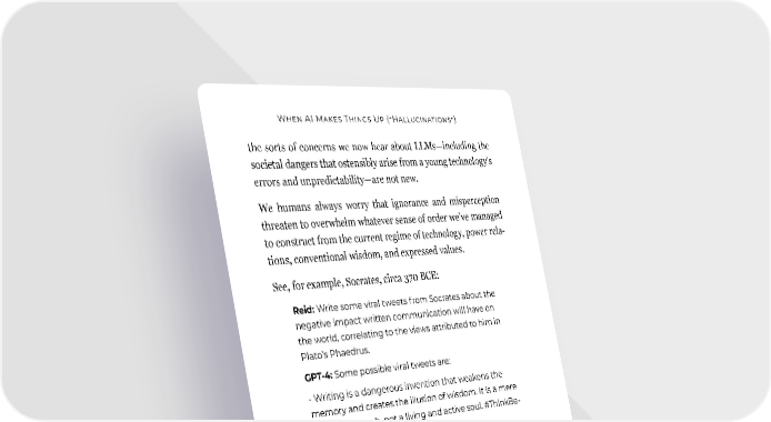 When AI Makes Things Up (“Hallucinations”) the sorts of concerns we now hear about LLMs—including the societal dangers that ostensibly arise from a young technology’s errors and unpredictability—are not new. We humans always worry that ignorance and misperception threaten to overwhelm whatever sense of order we’ve managed to construct from the current regime of technology, power rela- tions, conventional wisdom, and expressed values. See, for example, Socrates, circa 370 BCE: Reid: Write some viral tweets from Socrates about the negative impact written communication will have on the world, correlating to the views attributed to him in Plato’s Phaedrus. GPT-4: Some possible viral tweets are: - Writing is a dangerous invention that weakens the memory and creates the illusion of wisdom. It is a mere image of speech, not a living and active soul. #ThinkBe- foreYouInk - The written word is a poor substitute for the spoken word. It cannot adapt to different audiences, contexts, or purposes. It cannot convey tone, emotion, or intention. It cannot correct, clarify, or elaborate. It is a rigid and dead letter. #SpeakYourMind - Writing is a form of forgetfulness, not of learning. It makes us rely on external signs, not on internal recollec- tion. It makes us lazy, not diligent. It makes us superfi- cial, not profound. It makes us ignorant, not knowledge- able. #RememberToRemember Of course, it’s not irrational to feel forever on the brink of intellectual anarchy. As countless surveys and studies attest, 155
