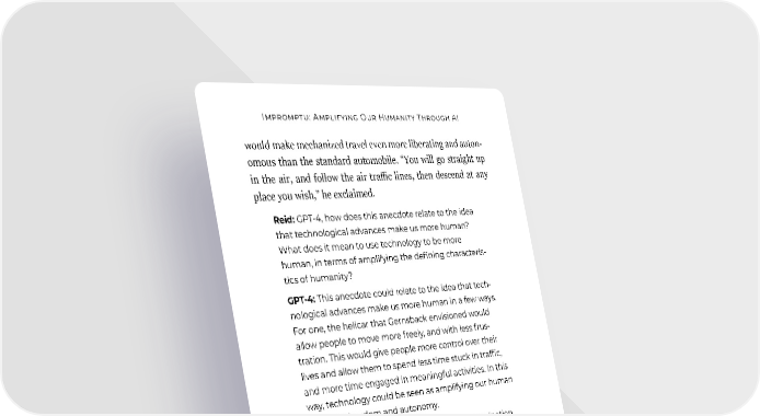 Impromptu: Amplifying Our Humanity Through AI would make mechanized travel even more liberating and auton- omous than the standard automobile. “You will go straight up in the air, and follow the air traffic lines, then descend at any place you wish,” he exclaimed. Reid: GPT-4, how does this anecdote relate to the idea that technological advances make us more human? What does it mean to use technology to be more human, in terms of amplifying the defining characteris- tics of humanity? GPT-4: This anecdote could relate to the idea that tech- nological advances make us more human in a few ways. For one, the helicar that Gernsback envisioned would allow people to move more freely, and with less frus- tration. This would give people more control over their lives and allow them to spend less time stuck in traffic, and more time engaged in meaningful activities. In this way, technology could be seen as amplifying our human desirefor freedom and autonomy. Additionally, Gernsback’s enthusiasm and imagination in describing the helicar speaks to the human drive to create and innovate. Human beings are natural prob- lem-solvers, and technology often becomes the vehi- cle through which we address challenges and make improvements to our lives. In this sense, technological advances can be seen as an expression of our human ingenuity and creativity. Nearly fifty years after Gernsback imagined that helicars would become a standard feature of America’s cities, companies like Joby Aviation are finally on the verge of making that vision a reality. What’s even more notable about Gernsback’s dream of air taxis is not the ambition of his timetable, but rather that he dared to dream it in the first place. 188