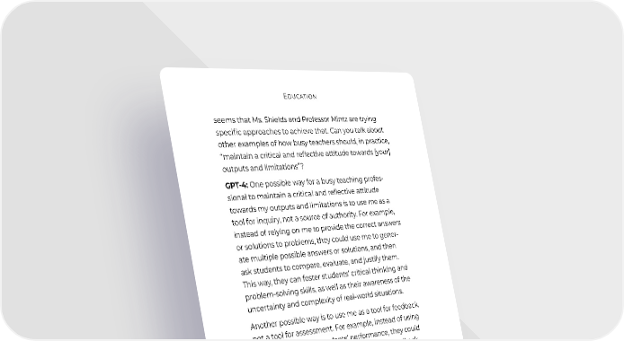 Education seems that Ms. Shields and Professor Mintz are trying specific approaches to achieve that. Can you talk about other examples of how busy teachers should, in practice, “maintain a critical and reflective attitude towards [your] outputs and limitations”? GPT-4: One possible way for a busy teaching profes- sional to maintain a critical and reflective attitude towards my outputs and limitations is to use me as a tool for inquiry, not a source of authority. For example, instead of relying on me to provide the correct answers or solutions to problems, they could use me to gener- ate multiple possible answers or solutions, and then ask students to compare, evaluate, and justify them. This way, they can foster students’ critical thinking and problem-solving skills, as well as their awareness of the uncertainty and complexity of real-world situations. Another possible way is to use me as a tool for feedback, not a tool for assessment. For example, instead of using me to grade or rank students’ performance, they could use me to provide formative and diagnostic feedback that can help students identify their strengths and areas for improvement, and suggest resources or strategies that can help them learn better. * * * These prompts and answers were culled from several sessions with GPT-4 suggesting various ways to help students learn alongside LLMs. It excelled at creating detailed and specific lesson plans for diverse students, such as learners with special needs or different levels of prior knowledge. My friends who are teachers found these examples impressive. I intend to use them to help me any time I am asked to address or lecture college students. 33