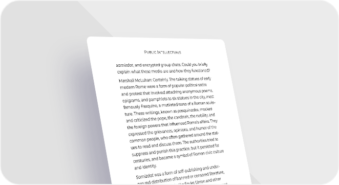 Public Intellectuals samizdat, and encrypted group chats. Could you briefly explain what these media are and how they functioned? Marshall McLuhan: Certainly. The talking statues of early modern Rome were a form of popular political satire and protest that involved attaching anonymous poems, epigrams, and pamphlets to six statues in the city, most famously Pasquino, a mutilated torso of a Roman sculp- ture. These writings, known as pasquinades, mocked and criticized the pope, the cardinals, the nobility, and the foreign powers that influenced Rome’s affairs. They expressed the grievances, opinions, and humor of the common people, who often gathered around the stat- ues to read and discuss them. The authorities tried to suppress and punish this practice, but it persisted for centuries, and became a symbol of Roman civic culture and identity. Samizdat was a form of self-publishing and under- ground distribution of banned or censored literature, art, and information in the Soviet Union and other communist countries. It involved typing, copying, and circulating manuscripts, often by hand, that challenged the official ideology, exposed the realities of life under totalitarianism, and expressed alternative views and values. Samizdat was a risky and costly activity, as it exposed the authors and readers to harassment, arrest, and imprisonment by the state security agencies. But it also created a network of solidarity, resistance, and cre- ativity among dissidents, intellectuals, and activists, who sought to preserve and share their cultural and political heritage and aspirations. Encrypted group chats are a form of digital communi- cation that uses encryption software and applications to protect the privacy and security of the messages and files exchanged among a group of users. They allow people to communicate and coordinate across borders 177
