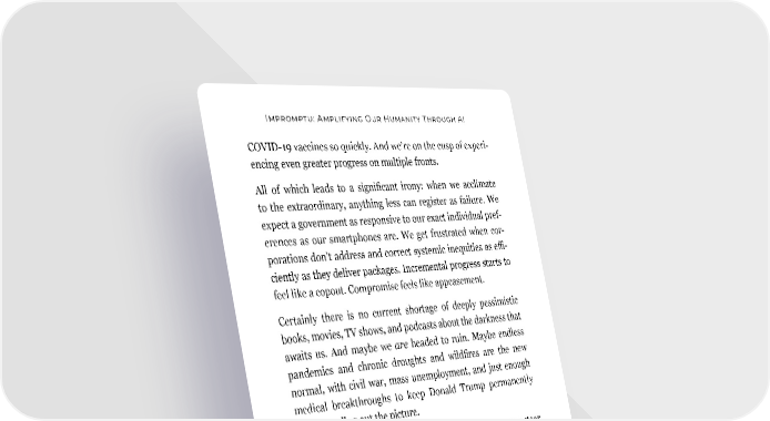 Impromptu: Amplifying Our Humanity Through AI COVID-19 vaccines so quickly. And we’re on the cusp of experi- encing even greater progress on multiple fronts. All of which leads to a significant irony: when we acclimate to the extraordinary, anything less can register as failure. We expect a government as responsive to our exact individual pref- erences as our smartphones are. We get frustrated when cor- porations don’t address and correct systemic inequities as effi- ciently as they deliver packages. Incremental progress starts to feel like a copout. Compromise feels like appeasement. Certainly there is no current shortage of deeply pessimistic books, movies, TV shows, and podcasts about the darkness that awaits us. And maybe we are headed to ruin. Maybe endless pandemics and chronic droughts and wildfires are the new normal, with civil war, mass unemployment, and just enough medical breakthroughs to keep Donald Trump permanently alive rounding out the picture. But the futures we imagine are inevitably the futures we steer toward. That’s why it’s so important to dream dreams that go well past salvaging what we can from the status quo —dreams that peer into seeming dystopia and envision what could possi- bly go right. I call myself a techno-humanist. I know the phrase strikes some as an oxymoron: technology and humanity can sometimes seem like oppositional forces. What’s so human about algorithms that turn moral discretion into math equations? What’s so human about scale disinformation systematically eroding our appetite for consensus and mutual benefit? 196