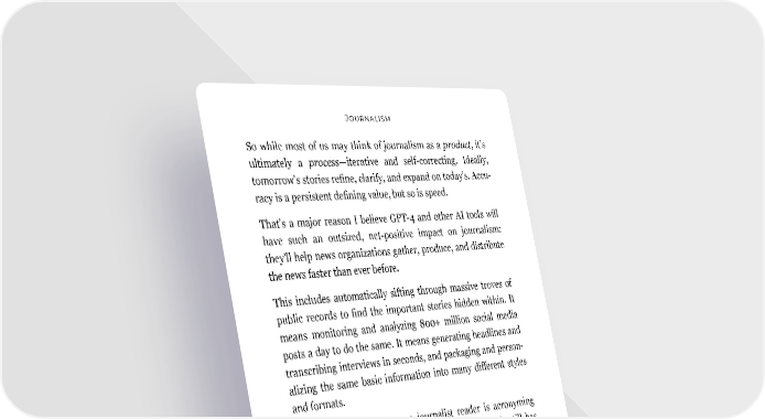 Journalism So while most of us may think of journalism as a product, it’s ultimately a process—iterative and self-correcting. Ideally, tomorrow’s stories refine, clarify, and expand on today’s. Accu- racy is a persistent defining value, but so is speed. That’s a major reason I believe GPT-4 and other AI tools will have such an outsized, net-positive impact on journalism: they’ll help news organizations gather, produce, and distribute the news faster than ever before. This includes automatically sifting through massive troves of public records to find the important stories hidden within. It means monitoring and analyzing 800+ million social media posts a day to do the same. It means generating headlines and transcribing interviews in seconds, and packaging and person- alizing the same basic information into many different styles and formats. “AYFKM?!” I imagine some journalist reader is acronyming right now. “You want to use GPT-4, which definitely still has that pesky side effect of making shit up, to amplify journal- ism’s misguided mandate to be first more than factual? Half- baked and half-right? If it speeds, it leads?” Hold your tweets, please. That’s not what I mean. Moving forward, good journalism will still require painstaking work and judicious but urgent human discernment and assess- ment. Good journalism will still require a prudent, thorough, multi-stage editorial process. That’s not changing any time soon. Sometimes, the process won’t actually be that fast. Some- times (just like before AI), it won’t be error-free. 81
