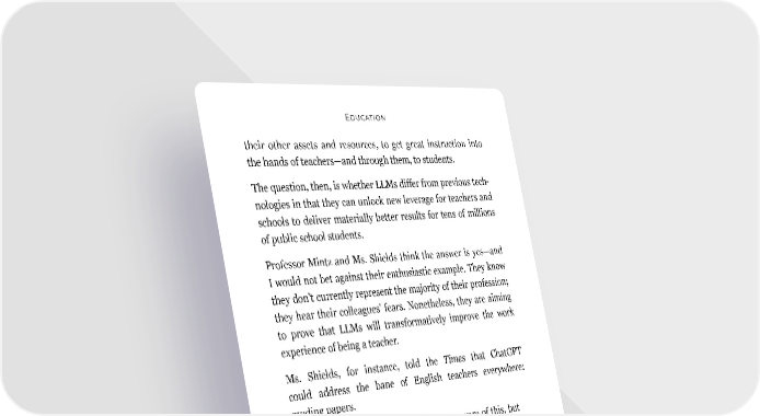 Education their other assets and resources, to get great instruction into the hands of teachers—and through them, to students. The question, then, is whether LLMs differ from previous tech- nologies in that they can unlock new leverage for teachers and schools to deliver materially better results for tens of millions of public school students. Professor Mintz and Ms. Shields think the answer is yes—and I would not bet against their enthusiastic example. They know they don’t currently represent the majority of their profession; they hear their colleagues’ fears. Nonetheless, they are aiming to prove that LLMs will transformatively improve the work experience of being a teacher. Ms. Shields, for instance, told the Times that ChatGPT could address the bane of English teachers everywhere: grading papers. Ms. Shields: “I don’t know if you are aware of this, but . . . it [ChatGPT] can evaluate writing. So one of the things I asked it to do last night was I had a student essay. Just for grins I said, ‘Evaluate this essay for grammatical and sentence structure.’ And it did really well.” NYT interviewer: “Wow.” Ms. Shields: “And it said here’s—and it gave him [the student] the strengths. It said, ‘Here’s what you’re doing well.’ And then it said, ‘Here are some places to work on.’ And it even said stuff like, ‘Your transitions aren’t very smooth, and your introduction is lacking, 37