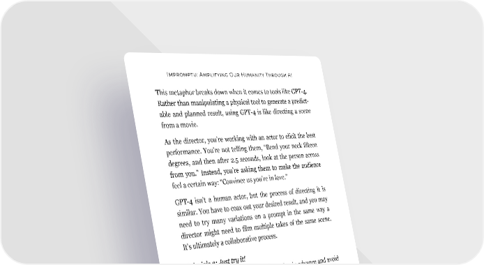 Impromptu: Amplifying Our Humanity Through AI This metaphor breaks down when it comes to tools like GPT-4. Rather than manipulating a physical tool to generate a predict- able and planned result, using GPT-4 is like directing a scene from a movie. As the director, you’re working with an actor to elicit the best performance. You’re not telling them, “Bend your neck fifteen degrees, and then after 2.5 seconds, look at the person across from you.” Instead, you’re asking them to make the audience feel a certain way: “Convince us you’re in love.” GPT-4 isn’t a human actor, but the process of directing it is similar. You have to coax out your desired result, and you may need to try many variations on a prompt in the same way a director might need to film multiple takes of the same scene. It’s ultimately a collaborative process. Principle 3: Just try it! In most of our work, we’re taught to plan in advance and avoid making mistakes. That’s because implementing a plan is costly in terms of time and other resources—there’s a reason a car- penter’s adage is to measure twice and cut once. But what if implementing a plan was cheaper and faster than thinking about it? That’s the confounding paradox of GPT-4 and LLMs. In far less time than it takes to debate a plan, GPT-4 can simply gen- erate a complete response for you to review. If you don’t like the response, you can throw it away and generate another one, or you might just generate three variations to give you more potential choices. 134