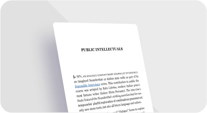PUBLIC INTELLECTUALS In 1974, an imagined contemporary journalist interviewed an imagined Neanderthal on Italian state radio as part of its Impossible Interviews series. This contribution to public dis- course was scripted by Italo Calvino, modern Italian prose’s most famous writer (before Elena Ferrante). The interview’s finale featured the Neanderthal’s striking assertion that his con- temporaries’ playful exploration of combinations generated not only new stone tools, but also all future language and culture. Cultures since antiquity have used “dialogue” forms to explore topics of public importance. Calvino’s obviously impossi- ble, fictive interview sets the stage for this chapter’s examples of what GPT-4 seems consistently (and appropriately) to call possible interviews between pairs of widely honored public intellectuals. Some of them may be unfamiliar to some of you, but in any case, please don’t construe the GPT-4-generated possible inter- views below as centering in importance or value the handful of authors, themes, or perspectives that comprise them. They are a starting point for further discussion. Anyone reading these words is familiar with technologies for the mechanical reproduction and distribution of public intellectuals’ words. From the days of scribes and sopherim 165
