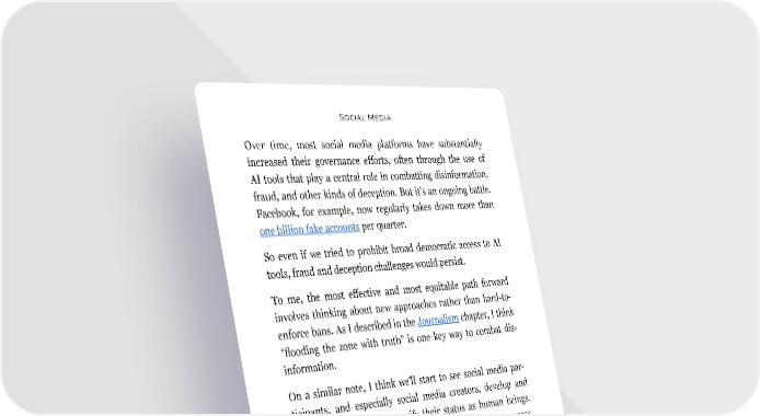Social Media Over time, most social media platforms have substantially increased their governance efforts, often through the use of AI tools that play a central role in combatting disinformation, fraud, and other kinds of deception. But it’s an ongoing battle. Facebook, for example, now regularly takes down more than one billion fake accounts per quarter. So even if we tried to prohibit broad democratic access to AI tools, fraud and deception challenges would persist. To me, the most effective and most equitable path forward involves thinking about new approaches rather than hard-to- enforce bans. As I described in the Journalism chapter, I think “flooding the zone with truth” is one key way to combat dis- information. On a similar note, I think we’ll start to see social media par- ticipants, and especially social media creators, develop and implement new ways to verify their status as human beings. Platforms themselves will likely participate in this process, continuing and expanding on their early efforts to establish real identity. How exactly this will play out I’m not sure. It just strikes me that, as the logical consequence of living in a world where AI tools can convincingly simulate human expression, actual humans will seek ways to convey that they are corporeal beings. In short, they will flood the zone with their humanity. If you’re thinking that maybe this sounds like a lot of trouble to go through just to enable a world where hustle bros fill the web with spam and SEO content, it’s important to always keep two key facts in mind. 103