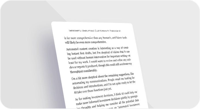 Impromptu: Amplifying Our Humanity Through AI is far more comprehensive than any human’s, and future tools will likely be even more comprehensive. Automated content creation is interesting as a way of creat- ing instant first drafts, but I’m skeptical of claims that it can be used without human intervention for important writing—at least for my work. I would want to review and refine any arti- cles or reports it produced, though this could still accelerate my throughput considerably. I’m a bit more skeptical about the remaining suggestions, like automating my communications. People email me looking for decisions and introductions, and I’m not quite ready to let the AI take over those functions just yet. As for making investment decisions, I think AI could help me make more informed investment decisions quickly by prompt- ing thoughts and helping me consider all the potential data points, but labeling this process an “automated investment decision” seems like a stretch. Despite these minor objections, GPT-4 helped me tackle this chapter by generating a reasonable taxonomy of my work, with pointers to where I might dive deeper. Since we’ve already spent a chapter on the transformation of work in the business world, let’s focus on my work as a writer/creator and philanthropist. How will AI transform these non-business worlds? My writing Those who follow my career closely know that I didn’t set out to be an entrepreneur. When I graduated from Stanford, my plan was to become a professor. I wanted to have a positive impact on society, and I thought the best way to do this was to pursue 136