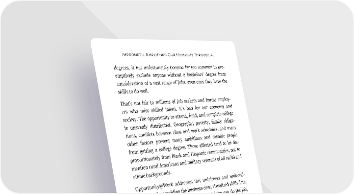 Impromptu: Amplifying Our Humanity Through AI degrees, it has unfortunately become far too common to pre- emptively exclude anyone without a bachelors’ degree from consideration of a vast range of jobs, even ones they have the skills to do well. That’s not fair to millions of job seekers and harms employ- ers who miss skilled talent. It’s bad for our economy and society. The opportunity to attend, fund, and complete college is unevenly distributed. Geography, poverty, family obliga- tions, conflicts between class and work schedules, and many other factors prevent many ambitious and capable people from getting a college degree. Those affected tend to be dis- proportionately from Black and Hispanic communities, not to mention rural Americans and military veterans of all racial and ethnic backgrounds. Opportunity@Work addresses this unfairness and underval- ued talent by providing the business case, visualized skills data, and tools to “tear the paper ceiling” so “if you can do the job, you can get the job.” It helps connect networks of technology employers with the 50 percent of U.S. workers who are skilled through alternative routes (STARs) like community college, workforce training, bootcamps, certificate programs, mili- tary service or learning in frontline jobs that are low-paid, but are not low-skilled. It also helps those “routes,” pathways, or programs be discovered by employers whose skilled technical workforce needs match their learners’ skills. Let’s see if AI can help Opportunity@Work with its important and worthy mission. Reid: How can Opportunity@Work leverage AI to help more technology industry employers hire more workers 148