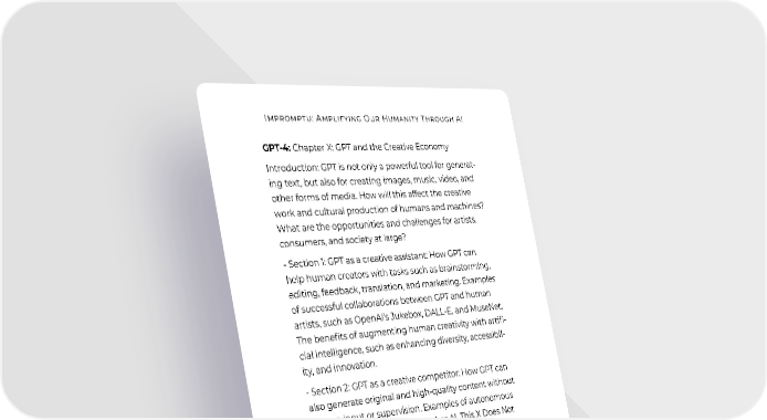 Impromptu: Amplifying Our Humanity Through AI GPT-4: Chapter X: GPT and the Creative Economy Introduction: GPT is not only a powerful tool for generat- ing text, but also for creating images, music, video, and other forms of media. How will this affect the creative work and cultural production of humans and machines? What are the opportunities and challenges for artists, consumers, and society at large? - Section 1: GPT as a creative assistant: How GPT can help human creators with tasks such as brainstorming, editing, feedback, translation, and marketing. Examples of successful collaborations between GPT and human artists, such as OpenAI’s Jukebox, DALL-E, and MuseNet. The benefits of augmenting human creativity with artifi- cial intelligence, such as enhancing diversity, accessibil- ity, and innovation. - Section 2: GPT as a creative competitor: How GPT can also generate original and high-quality content without human input or supervision. Examples of autonomous GPT creations, such as Philosopher AI, This X Does Not Exist, and AIDungeon. The risks of displacing human creators, undermining intellectual property, and eroding artistic value. The ethical and legal implications of AI authorship and ownership. - Section 3: GPT as a creative catalyst: How GPT can also inspire new forms of creative expression and cultural participation. Examples of hybrid and interactive GPT projects, such as Botnik Studios, GPT-3 Poetry, and Nove- lAI. The potential of fostering co-creation, remixing, and experimentation among human and machine agents. The challenges of ensuring quality, authenticity, and responsibility in the emerging creative economy. - Conclusion: GPT is transforming the landscape of cre- ative work and cultural production in unprecedented 64