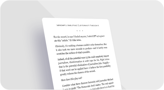 Impromptu: Amplifying Our Humanity Through AI * * * For the record, in case I fooled anyone, I asked GPT-4 to gener- ate this “article.” It’s fake news. Obviously, it’s nothing a human couldn’t write themselves. But it also took me mere seconds to produce—and it barely even scratches the surface of what’s possible. Indeed, of all the potential ways LLMs could negatively impact journalism, disinformation at scale tops the list. Right below that is the potential elimination of journalism jobs. Happily— if that word can be applied here—I believe the first possibility greatly reduces the chances of the second. How does this play out? Consider what Steve Bannon famously told journalist Michael Lewis in 2018: “The Democrats don’t matter. The real opposi- tion is the media. And the way to deal with them is to flood the zone with shit.” To date, the tendency of LLMs like Bing Chat and ChatGPT to produce inadvertent misinformation in their own faulty attempts to write statistically plausible “truth” has overshad- owed their potential use as disinformation fire hoses that bad actors could use to, ahem, muddy the waters of public discourse. Obviously, that potential is there, waiting patiently. When bad actors inevitably put these tools to such ends, I’m sure we’ll see calls for new regulation tailored specifically to AI-generated disinformation. We may even see efforts to ban 90