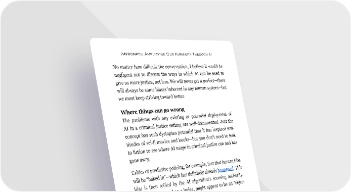 Impromptu: Amplifying Our Humanity Through AI No matter how difficult the conversation, I believe it would be negligent not to discuss the ways in which AI can be used to give us more justice, not less. We will never get it perfect—there will always be some biases inherent in any human system—but we must keep striving toward better. Where things can go wrong The problems with any existing or potential deployment of AI in a criminal justice setting are well-documented. Just the concept has such dystopian potential that it has inspired mul- titudes of sci-fi movies and books—but you don’t need to look to fiction to see where AI usage in criminal justice can and has gone awry. Critics of predictive policing, for example, fear that human bias will be “baked in”—which has definitely already happened. This bias is then reified by the AI algorithm’s seeming authority, which, even more than a judge, might appear to be an “objec- tive” decision maker. Facial recognition algorithms have also been problematic, resulting in multiple studies showing higher false positive rates on darker-skinned individuals. I could go on, but my point here is not to dwell on the down- sides, whether potential or actual. Instead, I think one of the most promising things about GPT-4, and the way OpenAI designed it to be used, is that it is putting AI’s power into the hands of individual citizens in the hope of empowering them in grassroots, decentralized, demo- cratic ways. 68