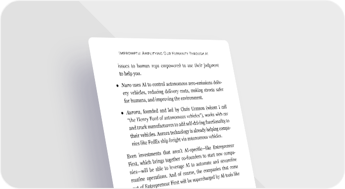 Impromptu: Amplifying Our Humanity Through AI issues to human reps empowered to use their judgment to help you. ● Nuro uses AI to control autonomous zero-emissions deliv- ery vehicles, reducing delivery costs, making streets safer for humans, and improving the environment. ● Aurora, founded and led by Chris Urmson (whom I call “the Henry Ford of autonomous vehicles”), works with car and truck manufacturers to add self-driving functionality to their vehicles. Aurora technology is already helping compa- nies like FedEx ship freight via autonomous vehicles. Even investments that aren’t AI-specific—like Entrepreneur First, which brings together co-founders to start new compa- nies—will be able to leverage AI to automate and streamline routine operations. And of course, the companies that come out of Entrepreneur First will be supercharged by AI tools like Tome, Coda, and Cresta. Clearly, I see AI as a transformative force in both my profes- sional and philanthropic work. I anticipate that it will help me be more efficient, productive, and creative in a variety of ways. I also see the potential for AI to amplify the impact of the orga- nizations I support by helping them connect with a wider audi- ence, streamline operations, and identify new opportunities. As an investor, I’m keenly aware of the potential for AI-pow- ered companies to achieve tremendous success, and as the world increasingly embraces AI, I’m positioning myself and my organizations to be at the forefront of this transformation. I hope you will do the same for you and yours. 152