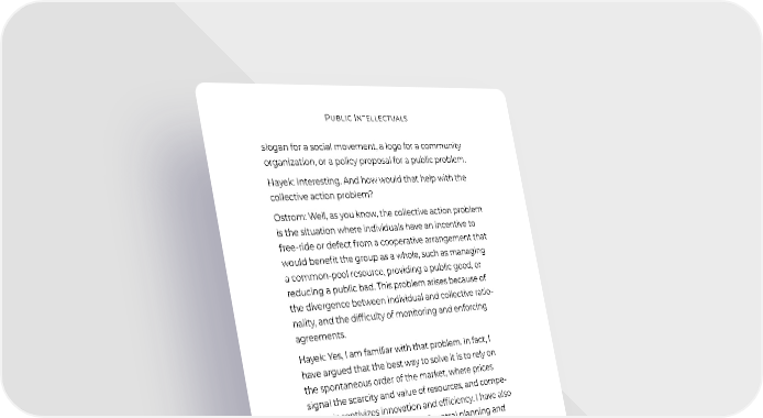 Public Intellectuals slogan for a social movement, a logo for a community organization, or a policy proposal for a public problem. Hayek: Interesting. And how would that help with the collective action problem? Ostrom: Well, as you know, the collective action problem is the situation where individuals have an incentive to free-ride or defect from a cooperative arrangement that would benefit the group as a whole, such as managing a common-pool resource, providing a public good, or reducing a public bad. This problem arises because of the divergence between individual and collective ratio- nality, and the difficulty of monitoring and enforcing agreements. Hayek: Yes, I am familiar with that problem. In fact, I have argued that the best way to solve it is to rely on the spontaneous order of the market, where prices signal the scarcity and value of resources, and compe- tition incentivizes innovation and efficiency. I have also warned against the dangers of central planning and intervention, which distort the price system, suppress local knowledge, and create perverse incentives. Ostrom: I agree with you that markets are an import- ant and powerful mechanism for coordinating human action, and that central planning and intervention often fail or backfire. However, I also think that markets are not the only or always the best solution, and that there are many cases where collective action problems require other forms of governance, such as self-organization, polycentricity, and participatory democracy. Hayek: How so? Ostrom: Well, for one thing, markets are not always perfect or complete. There are many situations where markets fail or are missing, such as externalities, public goods, common-pool resources, asymmetric informa- 179