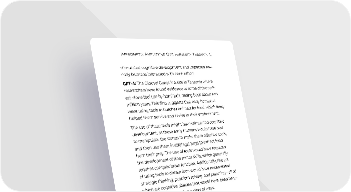 Impromptu: Amplifying Our Humanity Through AI stimulated cognitive development and impacted how early humans interacted with each other? GPT-4: The Olduvai Gorge is a site in Tanzania where researchers have found evidence of some of the earli- est stone tool use by hominids, dating back about two million years. This find suggests that early hominids were using tools to butcher animals for food, which likely helped them survive and thrive in their environment. The use of these tools might have stimulated cognitive development, as these early humans would have had to manipulate the stones to make them effective tools, and then use them in strategic ways to extract food from their prey. The use of tools would have required the development of fine motor skills, which generally requires complex brain function. Additionally, the act of using tools to obtain food would have necessitated strategic thinking, problem solving, and planning—all of which are cognitive abilities that would have been bene- ficial to early humans in a variety of ways. It’s difficult to say definitively, but if early humans were using tools to improve their chances of survival, they may have been able to devote more time and resources to social interaction, which could have led to the devel- opment of more complex communication systems and even the formation of larger social groups. Reid: OK, last one. What can you tell me about how the taming of fire changed early humans’ cognitive ability and social interactions? GPT-4: The taming of fire was a huge milestone for early humans. Fire allowed humans to cook food, which changed their diets, as well as stay warm and protect themselves from predators. It also allowed for greater social interaction, as fire could act as a focal point for gatherings. Some researchers have even suggested that 200
