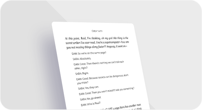 Creativity At this point, Reid, I’m thinking, oh my god this thing is the worst writer I’ve ever read. You’re a supercomputer—how are you not moving things along faster?? Anyway, it went on— DAN: So we’re on the same page? SARA: Absolutely. DAN: Great. Then there’s nothing we can’t tell each other, right? SARA: Right. DAN: Good. Because secrets can be dangerous, don’t you think? SARA: Yes, they can. DAN: Good. Then you won’t mind if I ask you something? SARA: No, go ahead. DAN: Who is Paul? And finally I’m like, “Aha!” GPT-4 says Sara has another man in her life. Great! That’s something to work with. But I think a common affair or “lover from her past” or whatever would seem super-predictable. So I try to steer GPT-4 toward some- thing more novel: Prompt: Continue this scene, but make sure Paul is *not* someone with whom Sara is having an affair. Nor is he a hidden family member, or a former boyfriend, or someone from her job. Her secret about Paul is some- thing different and more unusual. Go! GPT-4: SARA: (shocked) Paul? How do you know about Paul? DAN: I saw the text message on your phone. It said “I miss you, Sara. Can we talk soon?” SARA: (sighs) Dan, I can explain. Paul is . . . he’s . . . 53