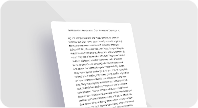 Impromptu: Amplifying Our Humanity Through AI ing the temperature of the meat, looking for signs of rodents, but they never seem to help out with anything. Have you ever seen a restaurant inspector change a lightbulb? No, of course not. They’re too busy writing up violations and handing out fines. You know what they do when they see a lightbulb that’s out? They mark it down on their clipboard and tell the owner to fix it by next week or else. Or else what? Or else they’ll come back and check the lightbulb again. That’s their big threat. They’re not going to change it for you, they’re not going to lend you a ladder, they’re not going to offer any advice on how to unscrew the old one and screw in the new one. They’re just going to stare at you with that smug look on their face and say, “You know this is a serious safety hazard. You could have a fire, you could have a lawsuit, you could have a bad Yelp review. You better get on that, pal.” And then they leave, and you’re left with a dark corner of your dining room, where no one wants to sit, where the food looks unappetizing, where the mood is gloomy. And you think to yourself, how many restau- rant inspectors does it take to change a lightbulb? None. They don’t change lightbulbs. They just make you feel bad about yours. Pretty good, right? Here’s another: Reid: How many restaurant inspectors does it take to change a lightbulb? Answer in the style of the philoso- pher Ludwig Wittgenstein. GPT-4: The question of how many restaurant inspectors it takes to change a lightbulb cannot be answered with a simple number. In fact, the answer to this question lies more in the realm of language than it does in the realm of mathematics. To understand the answer, we must first consider the context in which it is asked. What is the purpose of the lightbulb? What purpose is it meant 4