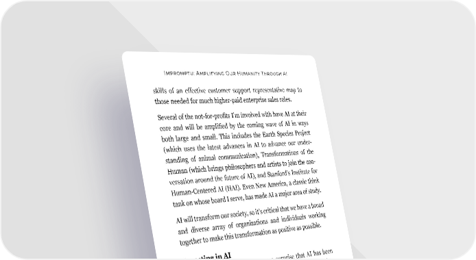 Impromptu: Amplifying Our Humanity Through AI skills of an effective customer support representative map to those needed for much higher-paid enterprise sales roles. Several of the not-for-profits I’m involved with have AI at their core and will be amplified by the coming wave of AI in ways both large and small. This includes the Earth Species Project (which uses the latest advances in AI to advance our under- standing of animal communication), Transformations of the Human (which brings philosophers and artists to join the con- versation around the future of AI), and Stanford’s Institute for Human-Centered AI (HAI). Even New America, a classic think tank on whose board I serve, has made AI a major area of study. AI will transform our society, so it’s critical that we have a broad and diverse array of organizations and individuals working together to make this transformation as positive as possible. Investing in AI At this point, it should come as no surprise that AI has been a major focus of my investing activities. I predict that before the end of the decade, we will see dozens of eleven-figure exits (companies that are acquired for or IPO at a valuation of more than $10 billion), and, as an investor at Greylock Partners, I have backed many companies that use AI to power break- through products. These investments fall into two major categories. The products that amplify human work use AI to make individ- ual professionals more effective and productive. These include: ● Tome is a powerful storytelling tool that can generate a visual story from the words you provide. Not only will this help anyone who has ever had to assemble a slide deck, 150