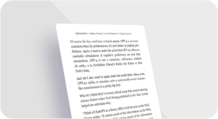 Impromptu: Amplifying Our Humanity Through AI Of course the key word here remains seems. GPT-4 is no more conscious than its predecessors; it’s just better at making pre- dictions. Again, I want to make the point that GPT-4’s often-re- markable simulations of cognitive proficiency are just that: simulations. GPT-4 is not a conscious, self-aware, sentient AI entity, a la Forbidden Planet’s Robby the Robot or Star Trek’s Data. And yet I also want to again make the point that—whoa, even GPT-4’s ability to simulate such a contextually-aware human- like consciousness is a pretty big deal. Why do I think this? A recent critical essay that award-winning science fiction writer Ted Chiang published in the New Yorker helped me articulate why. “Think of ChatGPT as a blurry JPEG of all the text on the Web,” Chiang writes. “It retains much of the information on the Web, in the same way that a JPEG retains much of the information of a higher-resolution image, but, if you’re looking for an exact sequence of bits, you won’t find it; all you will ever get is an approximation.” In Chiang’s view, the inexact representation of the information that comprises ChatGPT (and presumably similar LLMs like GPT-4) is what leads to both their synthetic powers and their tendency toward hallucinations and other errors. As “JPEG[s] of all the text on the Web,” they can synthesize information in novel ways because they have access to all this information at once. That allows them to take what they know about one thing, and then also what they know about something else, and con- vincingly mash them up into a new thing. 16