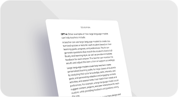 Education GPT-4: Other examples of how large language models can help teachers include: A teacher can use large language models to create cus- tomized quizzes or tests for each student based on their learning goals, progress, and preferences. The AI can generate questions that match the student’s level of dif- ficulty and learning style, as well as provide immediate feedback for each answer. The teacher can monitor the results and adjust the instruction or support accordingly. Large language models could help teachers create personalized learning paths for large classes of students by analyzing their prior knowledge, skills, interests, and goals, and generating adaptive and engaging content, activities, and assessments that match their needs and preferences. For example, a large language model could suggest content, projects, and peer interactions for each student, while providing feedback and guidance along the way. Large language models could help teachers design and facilitate collaborative learning experiences for large classes of students by generating prompts and scenar- ios to foster creative problem-solving, critical thinking, communication, and teamwork. For example, a large language model system could create simulations or games that challenge students to work together in groups to address real-world issues or questions, and provide feedback and scaffolding to support their collab- oration and learning outcomes. A teacher can use large language models to facilitate interactive discussions or debates among students on various topics or issues. The AI can act as a moderator or a participant, providing prompts, questions, facts, opinions, or counterarguments that stimulate critical thinking and dialogue. The teacher can observe the 39
