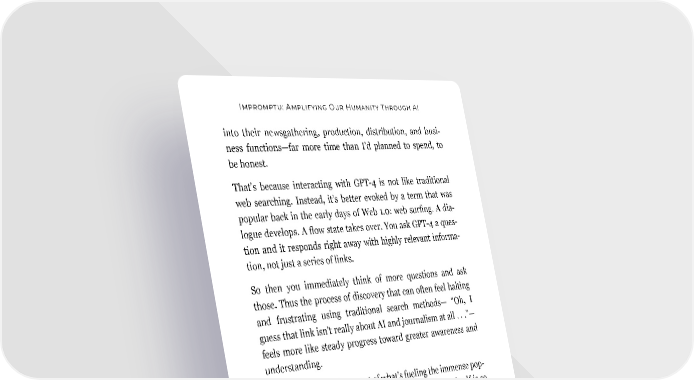 Impromptu: Amplifying Our Humanity Through AI into their newsgathering, production, distribution, and busi- ness functions—far more time than I’d planned to spend, to be honest. That’s because interacting with GPT-4 is not like traditional web searching. Instead, it’s better evoked by a term that was popular back in the early days of Web 1.0: web surfing. A dia- logue develops. A flow state takes over. You ask GPT-4 a ques- tion and it responds right away with highly relevant informa- tion, not just a series of links. So then you immediately think of more questions and ask those. Thus the process of discovery that can often feel halting and frustrating using traditional search methods— “Oh, I guess that link isn’t really about AI and journalism at all . . .”— feels more like steady progress toward greater awareness and understanding. This, I believe, is a huge part of what’s fueling the immense pop- ularity of GPT-4’s sibling, ChatGPT. The experience itself is so responsive and self-propelling that a kind of intellectual esca- lation kicks in: asking one question makes you want to ask ten. This phenomenon, I also realized, was a big part of the story I should tell in this chapter. Initially, I had assumed that I would highlight automated journalism, describing how news orga- nizations are already using databases and template-driven AI systems to produce thousands of stories about corporate earn- ings reports, weather forecasts, sports events, and more. But while automated journalism does represent a strategic oppor- tunity for news organizations, conversing with GPT-4 took me down a different path. 84