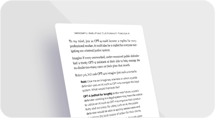 Impromptu: Amplifying Our Humanity Through AI To my mind, just as GPT-4 could become a copilot for every professional worker, it could also be a copilot for everyone nav- igating our criminal justice system. Imagine if every overworked, under-resourced public defender had a trusty GPT-4 assistant at their side to help manage the no-doubt-too-many cases on their plate that month. Better yet, let’s ask GPT-4 to imagine just such a scenario. Reid: Give me an imaginary scenario in which a public defender uses an AI such as GPT-4 to navigate the legal system. What would that look like? GPT-4 (edited for length): In the near future, a public defender working in a legal system may have the option to utilize an AI such as GPT-4 to improve their produc- tivity and accuracy. By using such an AI, the public defender would be able to quickly assess cases and determine the best course of action for their clients. The AI may be used to quickly search through cases in legal databases for relevant information, facts, and details. It could also be used to recommend legal strat- egies or tactics for the ongoing case. In some instances, its applications could even go beyond the traditional attorney-client relationship and provide advice on the best way to present a case in court or deal with compli- cated legal matters. Using an AI for such purposes could also work towards improving access to justice. People who are unfamiliar with the complexities of the legal system could find it easier to understand the proceedings due to the AI’s intuitive design and user-friendly interface. This could be especially beneficial for those who live in remote or rural areas where legal services may be scarce. 72