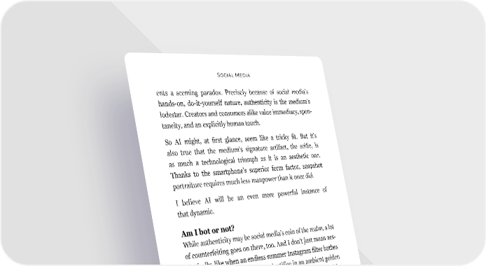 Social Media ents a seeming paradox. Precisely because of social media’s hands-on, do-it-yourself nature, authenticity is the medium’s lodestar. Creators and consumers alike value immediacy, spon- taneity, and an explicitly human touch. So AI might, at first glance, seem like a tricky fit. But it’s also true that the medium’s signature artifact, the selfie, is as much a technological triumph as it is an aesthetic one. Thanks to the smartphone’s superior form factor, snapshot portraiture requires much less manpower than it once did. I believe AI will be an even more powerful instance of that dynamic. Am I bot or not? While authenticity may be social media’s coin of the realm, a lot of counterfeiting goes on there, too. And I don’t just mean aes- thetically, like when an endless summer Instagram filter bathes the line between authenticity and artifice in an ambient golden glow. I mean potentially harmful forms of deception, like fake news stories, manipulated video, or that farmer from Iowa on Twitter who isn’t really a farmer, or Iowan, or human. Between the bots and the deepfakes, does it really make sense to add this kind of AI to the mix? While I addressed this in the Journalism chapter, it makes sense to address it here too. After all, it’s social media that has helped make disinformation so spreadable. It’s worth remembering that things didn’t start out this way. In many of its earliest incarnations, social media actually helped bring transparency and veracity to the online world. 101