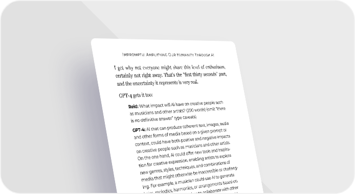 Impromptu: Amplifying Our Humanity Through AI I get why not everyone might share this level of enthusiasm, certainly not right away. That’s the “first thirty seconds” part, and the uncertainty it represents is very real. GPT-4 gets it too: Reid: What impact will AI have on creative people such as musicians and other artists? (200 words) (omit “there is no definitive answer” type caveats) GPT-4: AI that can produce coherent text, images, audio and other forms of media based on a given prompt or context, could have both positive and negative impacts on creative people such as musicians and other artists. On the one hand, AI could offer new tools and inspira- tion for creative expression, enabling artists to explore new genres, styles, techniques, and combinations of media that might otherwise be inaccessible or challeng- ing. For example, a musician could use AI to generate lyrics, melodies, harmonies, or arrangements based on their preferences or mood, or to collaborate with other artists across languages and cultures. A painter could use AI to create realistic or abstract landscapes, portraits, or compositions based on their vision or references. A writer could use AI to generate plot ideas, characters, dialogues or scenarios based on their genre or theme. On the other hand, AI could also pose some threats and challenges for creative people, such as undermining their originality, authenticity, and autonomy. For exam- ple, a musician could face plagiarism accusations or ethical dilemmas if they use AI to produce songs that are similar or identical to existing works or artists. A painter could lose their distinctive style or identity if they rely too much on AI to generate images that are indistin- guishable from human-made ones. A writer could lose their voice or agency if they let AI write their stories for them. Moreover, AI could also create more competition 48