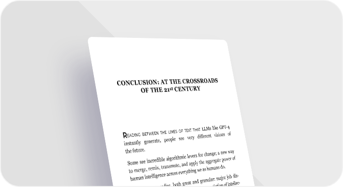CONCLUSION: AT THE CROSSROADS OF THE 21st CENTURY eading between the lines of text that LLMs like GPT-4 R instantly generate, people see very different visions of the future. Some see incredible algorithmic levers for change; a new way to merge, remix, transmute, and apply the aggregate power of human intelligence across everything we as humans do. Others see tragedies, both great and granular: major job dis- placement across multiple industries; appropriation of intellec- tual property without explicit consent; a depressed person who, after consulting an LLM, commits suicide. If a technology is truly revolutionary—if it’s destined to achieve the scale of fire, say, or the wheel, or even just the bathtub— then every person making predictions in that technology’s early days, whether utopian or apprehensive or in the middle, is Nos- tradamus. Sooner or later, they’re going to be at least anecdot- ally right. So yes, great things are coming with AI. And yes, bad things are coming with AI. I bring this up now simply to ask: where do you want to focus? 210