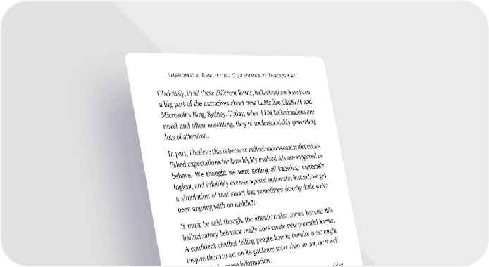 Impromptu: Amplifying Our Humanity Through AI Obviously, in all these different forms, hallucinations have been a big part of the narratives about new LLMs like ChatGPT and Microsoft’s Bing/Sydney. Today, when LLM hallucinations are novel and often unsettling, they’re understandably generating lots of attention. In part, I believe this is because hallucinations contradict estab- lished expectations for how highly evolved AIs are supposed to behave. We thought we were getting all-knowing, supremely logical, and infallibly even-tempered automata; instead, we get a simulation of that smart but sometimes sketchy dude we’ve been arguing with on Reddit?! It must be said though, the attention also comes because this hallucinatory behavior really does create new potential harms. A confident chatbot telling people how to hotwire a car might inspire them to act on its guidance more than an old, inert web page with the same information. So concerns are not unfounded. But as we try to fully consider LLMs’ pros and cons, I would add these points: ● In some circumstances, the power of “good enough knowl- edge” can be profoundly great. ● Before we decide that LLMs like GPT-4 produce too many errors to tolerate, we should try to understand how many errors they make—and how many errors we already accept in other sources. ● In certain contexts, an LLM’s ability to generate non-fac- tual information can be tremendously useful. (In humans we call it “imagination,” and it’s one of the qualities we most prize in ourselves.) 158
