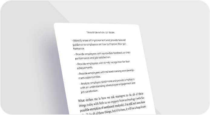 Transformation of Work - Identify areas of improvement and provide tailored guidance to employees on how to improve their per- formance. - Provide employees with up-to-date feedback on their performance and job satisfaction. - Provide employees with timely recognition for their achievements. - Provide employees with tailored training and develop- ment opportunities. - Analyze employee sentiment and provide employers with an understanding of employee engagement and job satisfaction. What strikes me is how we ask managers to do all of these things today with little to no support from technology (with the possible exception of sentiment analysis). I’m still not sure how AI will do all of these things, but if it does, it will be a huge boon to managers. Reid: What are some of the ways AI can help organi- zations define specific “tours of duty” for employees, which lay out a specific mission that both employer and employee can benefit from? GPT-4: AI can be used to . . . - Develop specific job descriptions and tasks, tailored to the employee’s skills and interests. - Identify potential opportunities for employees to prog- ress and develop their skills. - Provide employees with personalized guidance and advice on how to achieve their goals. - Analyze employee performance and suggest areas to focus on and improve. 119