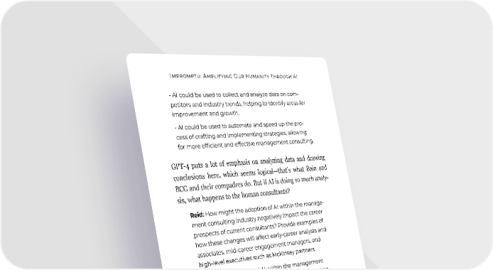 Impromptu: Amplifying Our Humanity Through AI - AI could be used to collect and analyze data on com- petitors and industry trends, helping to identify areas for improvement and growth. - AI could be used to automate and speed up the pro- cess of crafting and implementing strategies, allowing for more efficient and effective management consulting. GPT-4 puts a lot of emphasis on analyzing data and drawing conclusions here, which seems logical—that’s what Bain and BCG and their compadres do. But if AI is doing so much analy- sis, what happens to the human consultants? Reid: How might the adoption of AI within the manage- ment consulting industry negatively impact the career prospects of current consultants? Provide examples of how these changes will affect early-career analysts and associates, mid-career engagement managers, and high-level executives such as McKinsey partners. GPT-4: The adoption of AI within the management consulting industry could have a negative impact on the career prospects of current consultants. Early-career analysts and associates may be the most affected, as AI can automate many of the tasks they are responsible for, such as research, data analysis, and report writing. As AI systems become more sophisticated, these roles may become redundant, leading to a decrease in job oppor- tunities for these individuals. Mid-career engagement managers may also be affected by the adoption of AI. AI systems may be able to auto- mate the processes of creating and implementing strat- egies, making engagement managers’ roles less nec- essary. They may also be replaced by AI systems in their role of providing insights and advice to clients, as AI sys- tems become more capable of performing these tasks. 128