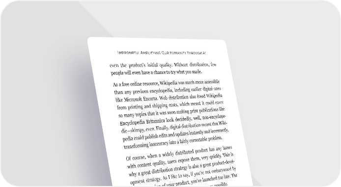 Impromptu: Amplifying Our Humanity Through AI even the product’s initial quality. Without distribution, few people will even have a chance to try what you made. As a free online resource, Wikipedia was much more accessible than any previous encyclopedia, including earlier digital ones like Microsoft Encarta. Web distribution also freed Wikipedia from printing and shipping costs, which meant it could cover so many topics that it was soon making print publications like Encyclopedia Britannica look decidedly, well, non-encyclope- dic—skimpy, even. Finally, digital distribution meant that Wiki- pedia could publish edits and updates instantly and incessantly, transforming inaccuracy into a fairly correctable problem. Of course, when a widely distributed product has any issues with content quality, users expose them, very quickly. This is why a great distribution strategy is also a great product-devel- opment strategy. As I like to say, if you’re not embarrassed by the first version of your product, you’ve launched too late. The goal is to start getting user feedback as soon as possible. From the start, lots of people clearly found Wikipedia’s crowd- sourced “good enough knowledge” useful enough to keep using. In turn, high usage led to more usefulness, as more feedback made Wikipedia better. Today, as one of the top ten most-visited websites in the U.S., the amount of accurate information Wikipedia distributes likely exceeds that of any news organization, encyclopedia, research organization, or other information publisher that might legit- imately claim a higher rate of accuracy. Whatever error might be in there, the good information Wikipedia distributes far outweighs it. Such is the power of “good enough knowledge.” 160